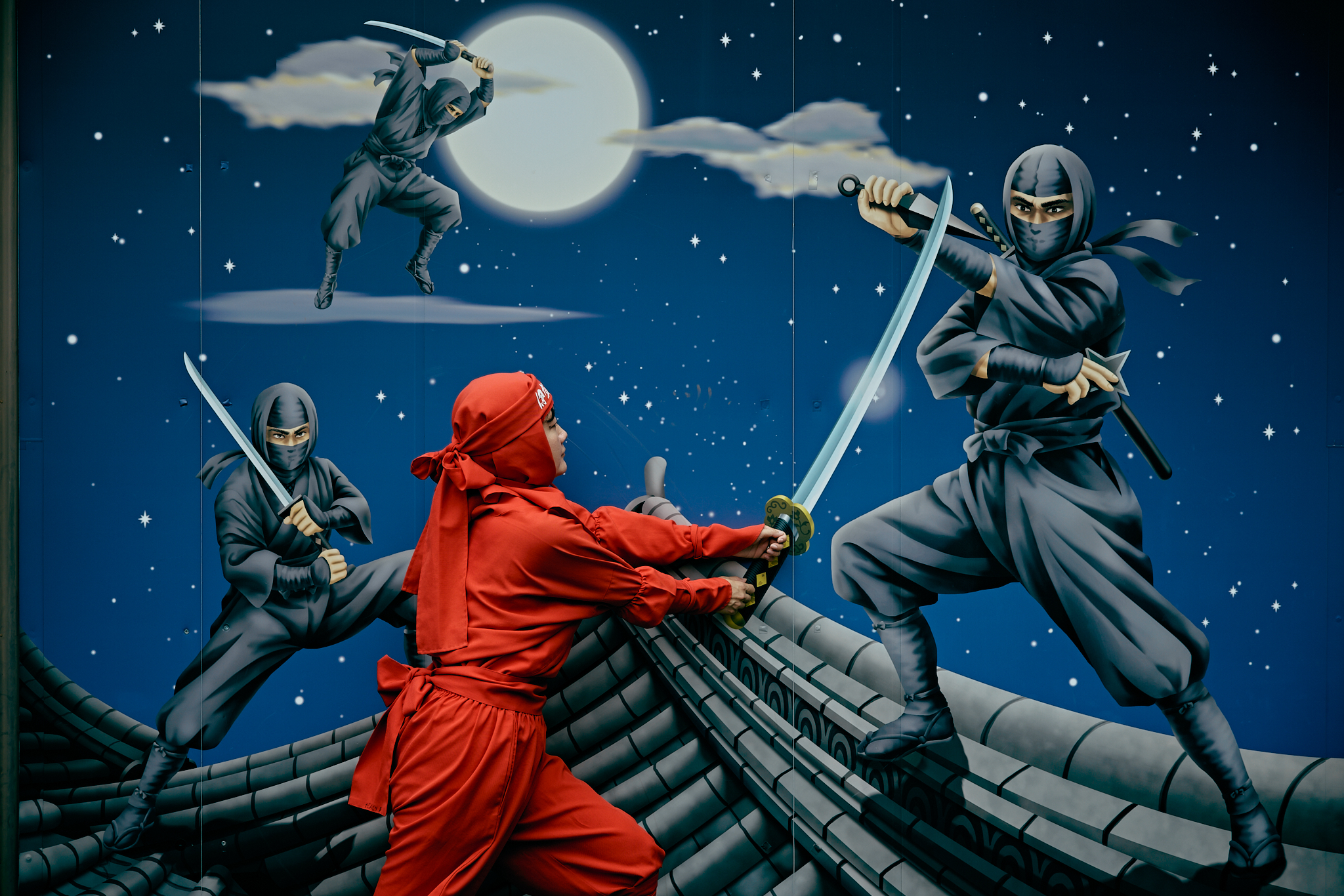 The castle town features numerous trick art spots depicting ninjas throwing shuriken (throwing stars) or fighting with swords in 3D. Stand in front of these trick art pieces while wearing a ninja costume, strike a cool pose, and take a photo right out of a movie or anime scene.