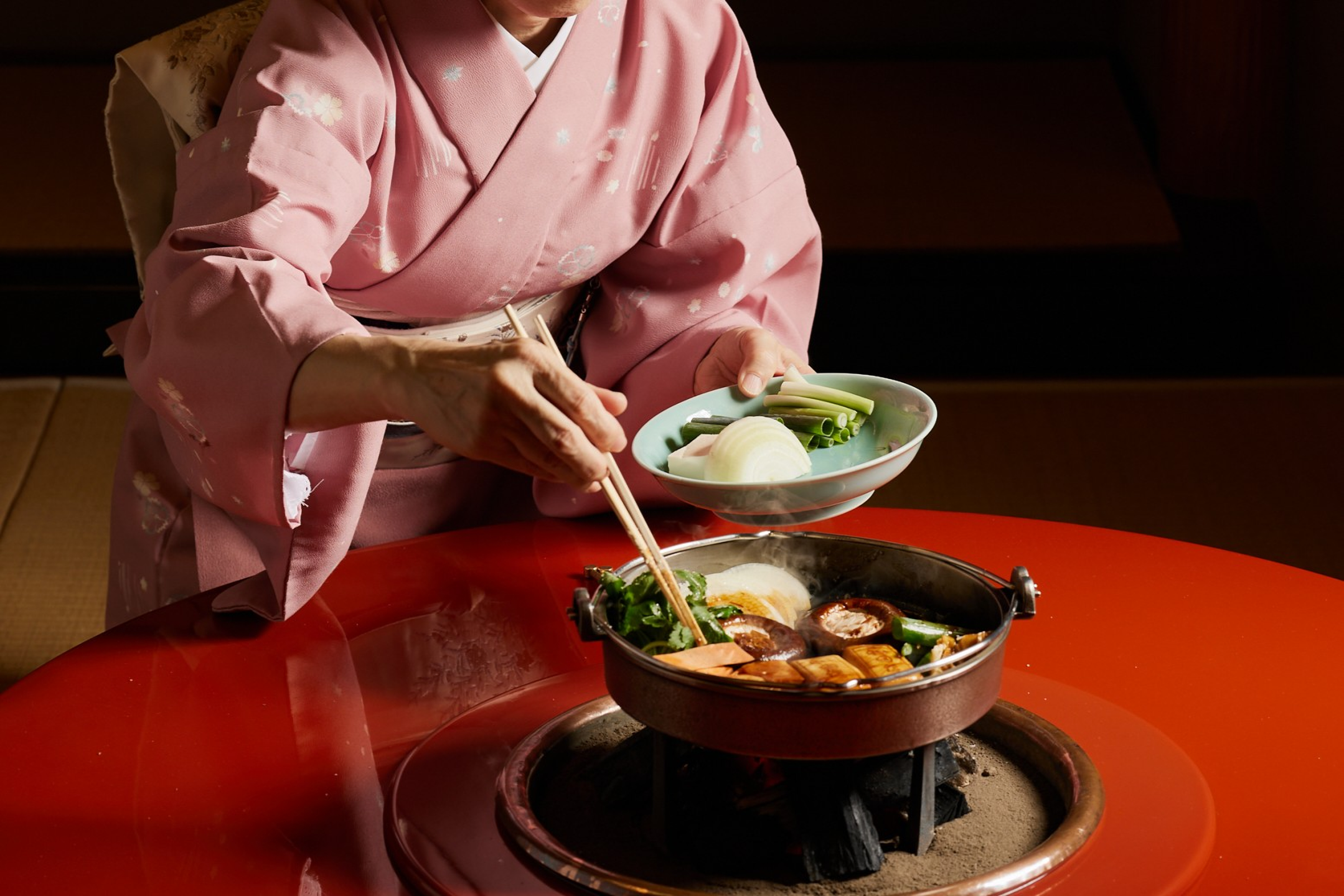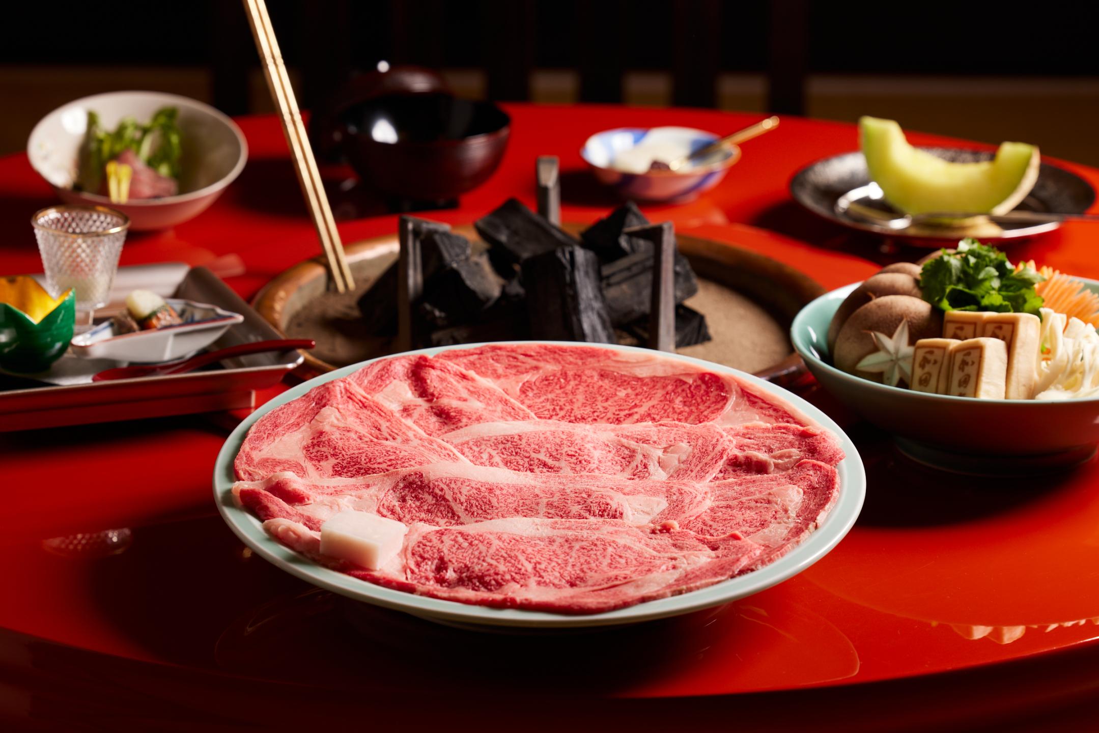 The signature dish is sukiyaki (starting at 14,000 yen), with thicker cuts compared to typical sukiyaki beef thanks to the use of fresh meat rather than frozen. An iron sukiyaki pot is heated over charcoal to slowly cook the meat at just the right temperature, bringing out the rich umami flavor of melt-in-the-mouth Matsusaka beef along with tamari soy sauce.