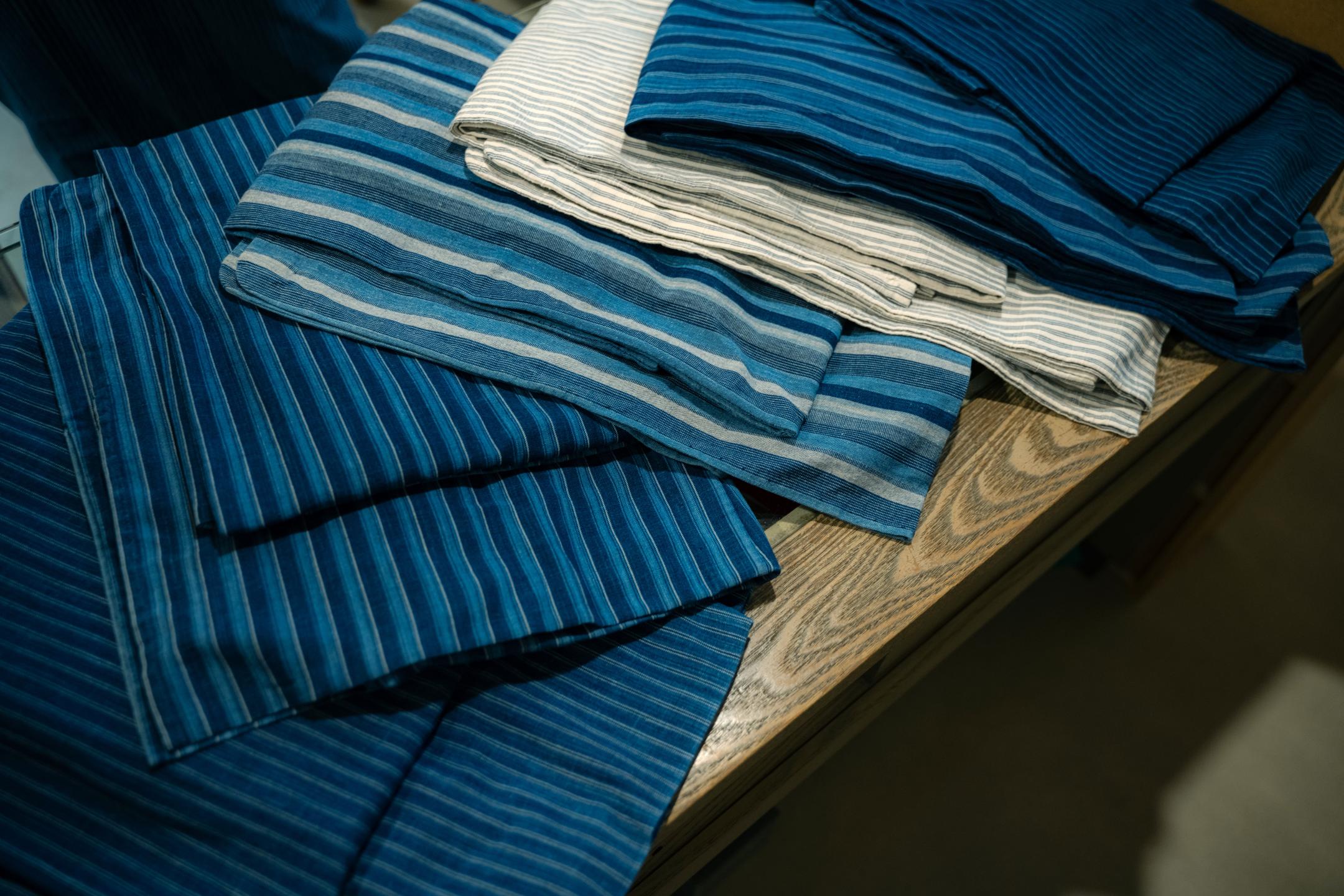 From a distance it appears solid, but up close the refined striped pattern reveals itself—an aesthetic that captivated people of the time. Women from farming families in Matsusaka would weave the fabric by hand late into the night and ship it to Edo (Tokyo) the following day.