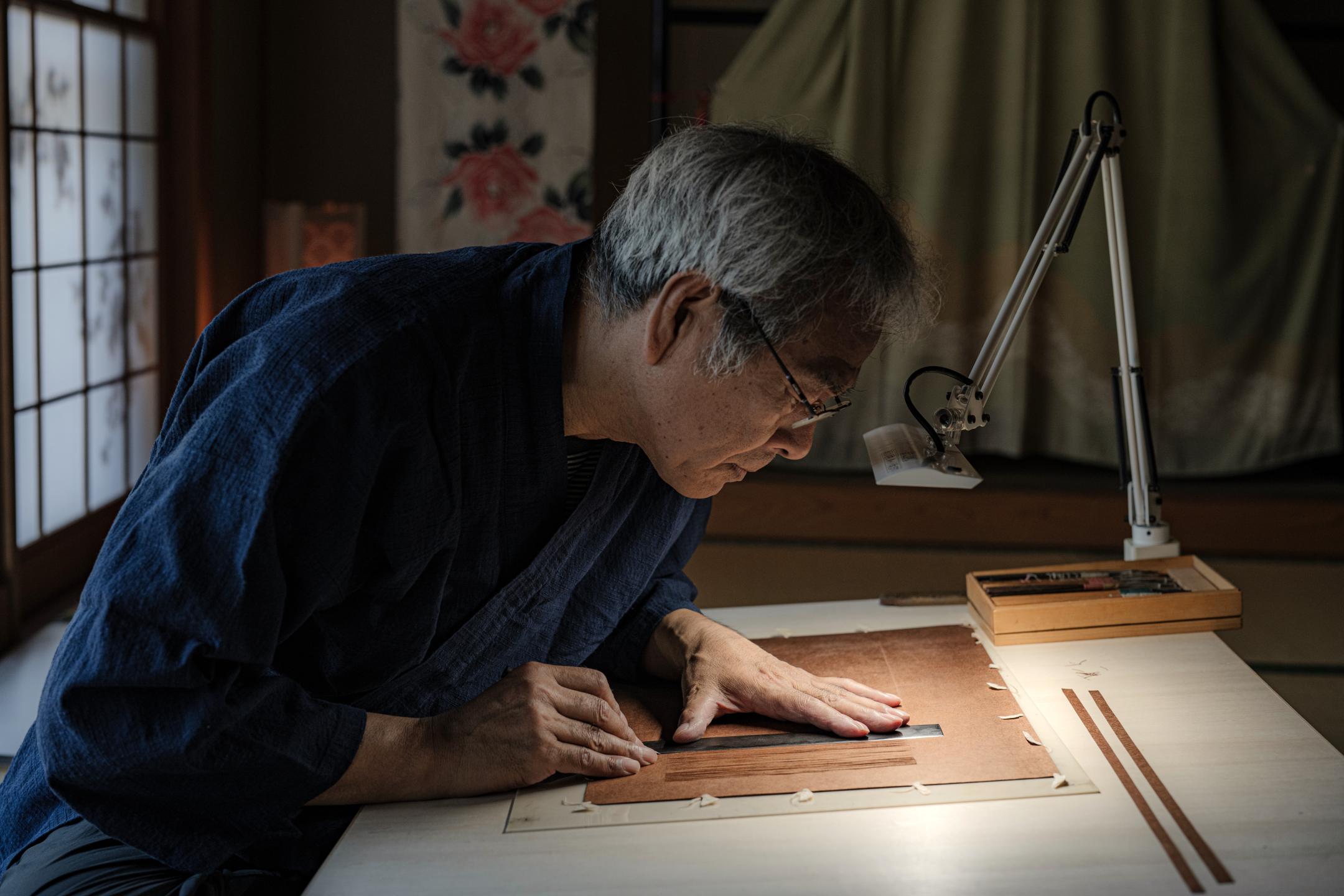 Ise katagami are paper stencils used for dyeing kimono and other garments. Made by pasting together a few sheets of Mino washi paper with persimmon tannin, then drying and smoking the paper before carving out a design, these tools are exquisite in their own right. This 1,000-year-old craft is said to have influenced movements such as Arts and Crafts in the United Kingdom and Art Nouveau in France.