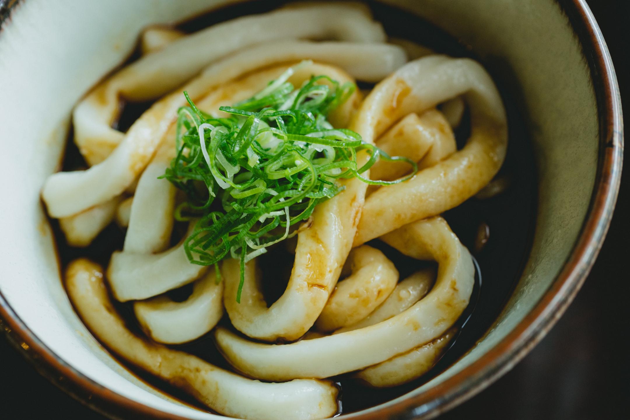 Fukusuke's sauce is homemade using natural dashi. The standard option is simply to add green onions. Take your chopsticks and mix the sauce, the noodles and green onions. Despite the rich appearance, the flavors are surprisingly mild. Handmade Ise Udon made with Mie-grown wheat (800 yen), available in limited quantities.