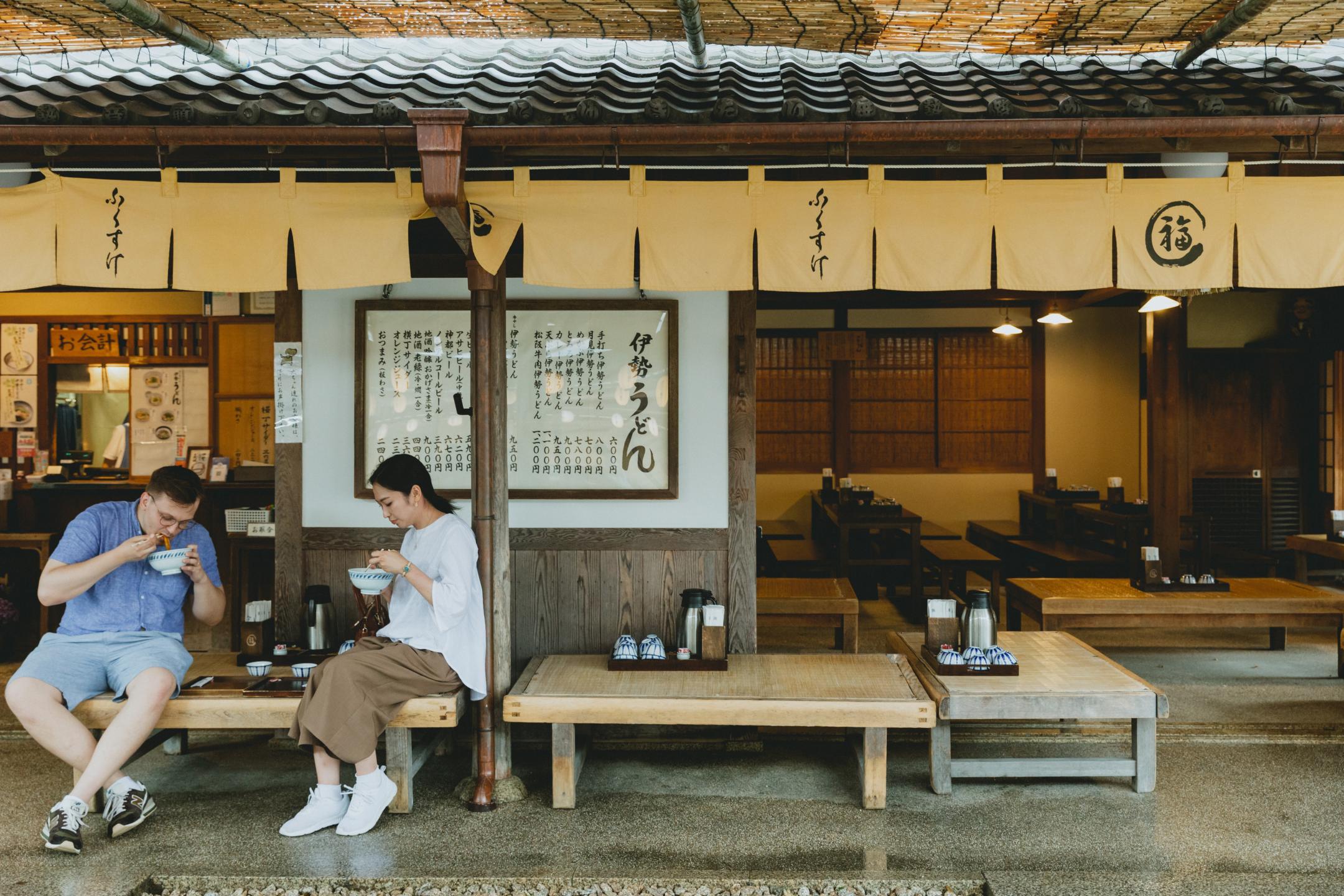 The restaurant Fukusuke serves Ise udon, a local specialty of thick, soft, chewy noodles with a rich, dark brown sauce made from dashi broth and tamari soy sauce. Noodles were apparently kept boiled so they could be served immediately to travelers, making this one of the first fast food concepts.