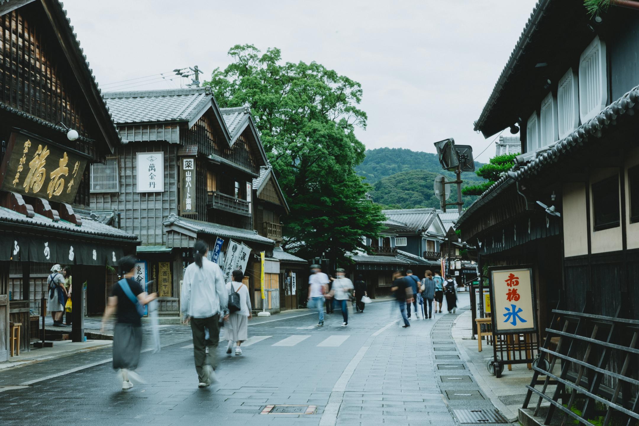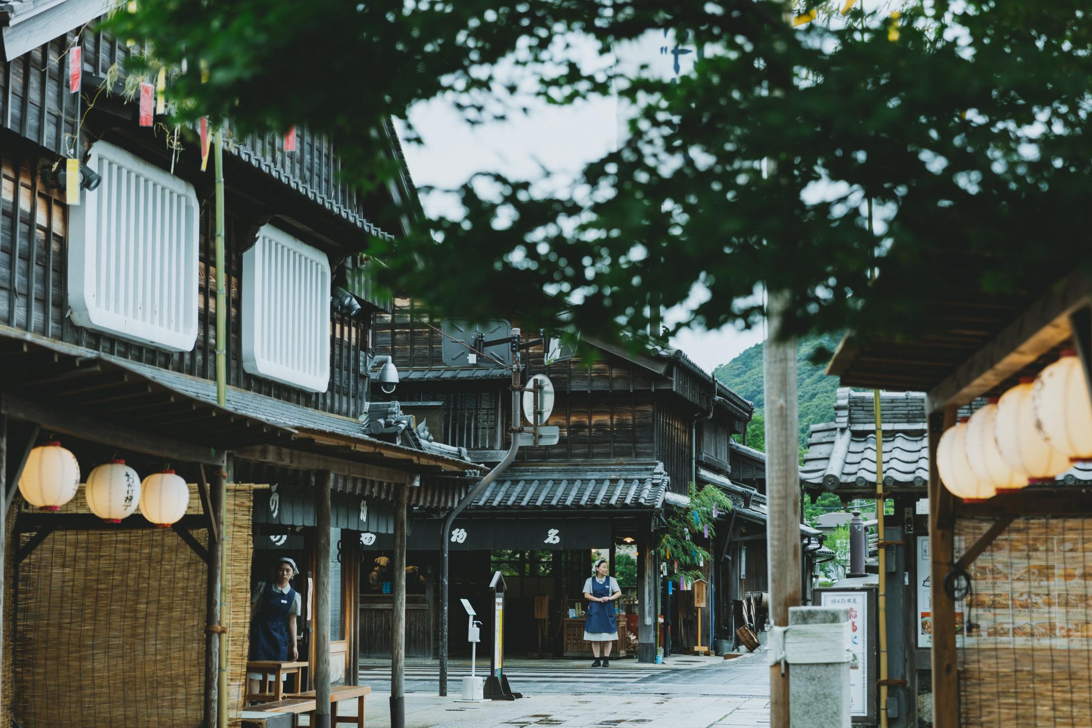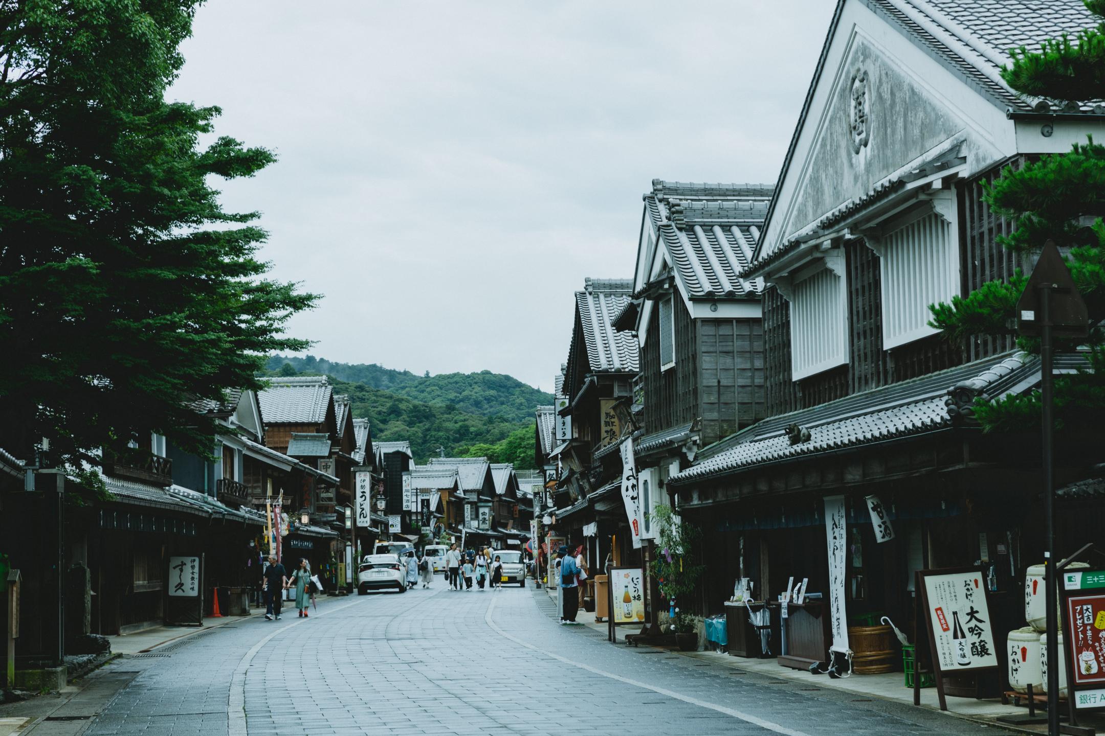 The straight path that extends from Ise Jingu is an old pilgrimage route known as Oharaimachi Street. During the Edo period, this 800-meter-long avenue from Uji Bridge along the Isuzu River was lined with buildings where lower-ranking priests and common people could go through purification rites and lodge. Even today, Oharaimachi Street retains buildings featuring Ise's unique architectural style of gabled roofs and entrances, evoking the atmosphere of centuries past.