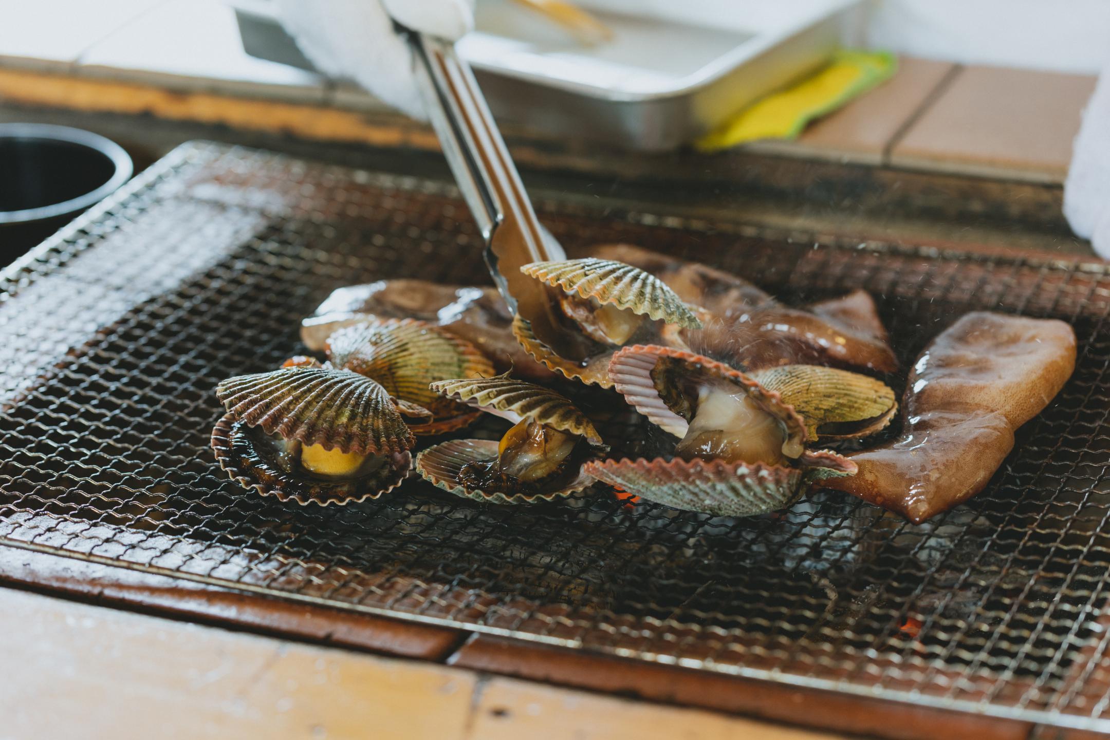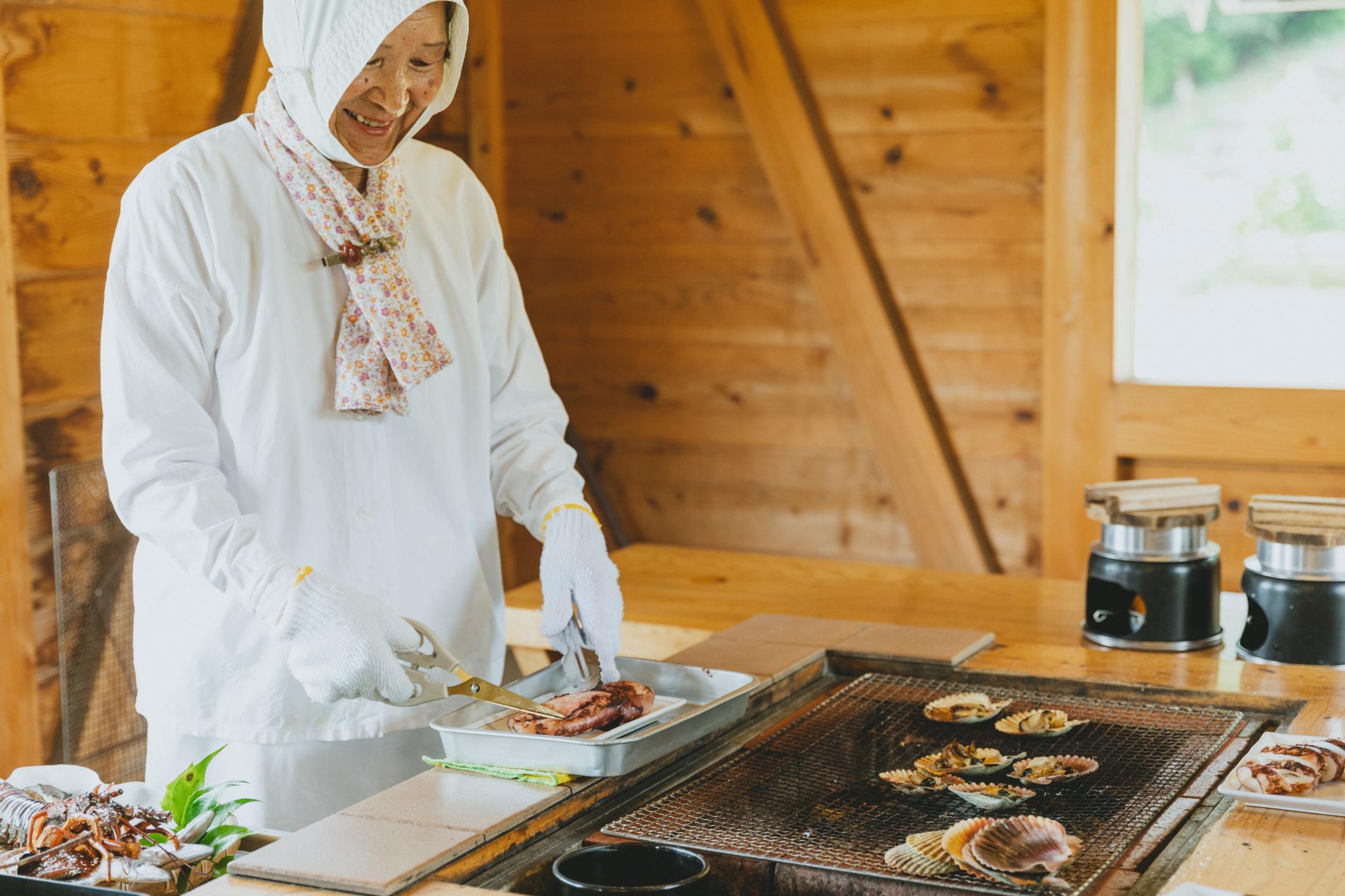 Located in Osatsucho, Toba City, Ama Hut "Hachiman Kamado” serves a wide range of courses, from recommended dishes (2,900 yen) to menus featuring “Shinsen” foods that are offered to the gods (50,000 yen). This is a great way to enjoy fresh seafood hand-grilled by the ama divers around a hearth as you listen to their stories.