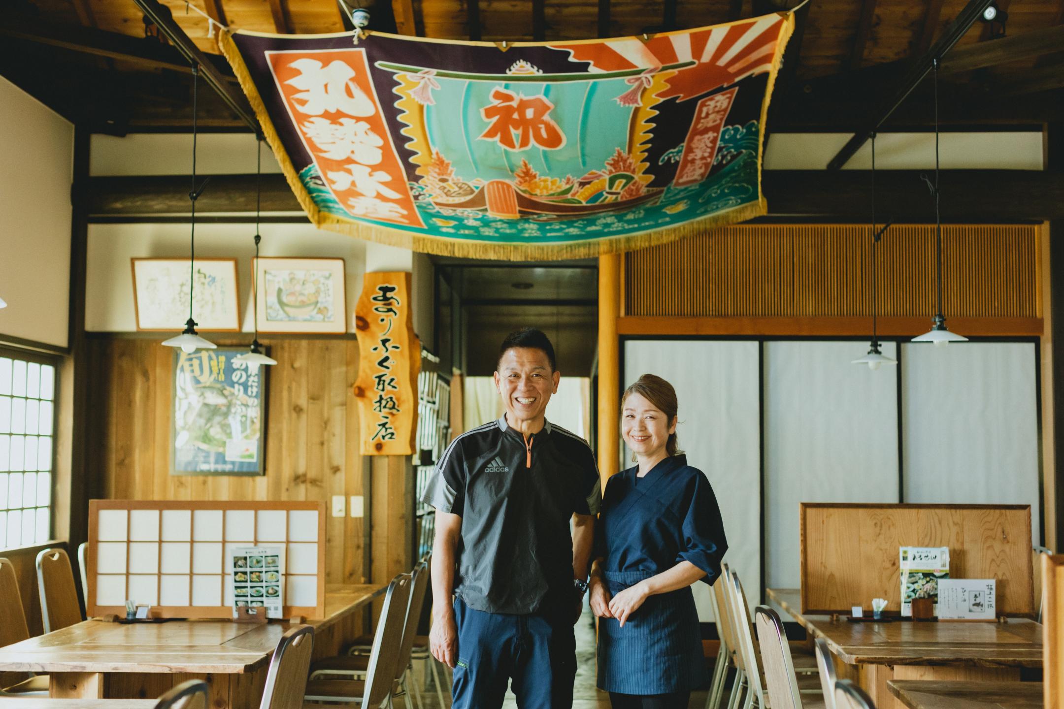 From March to September, the basic course is an abalone menu that also includes hinoki scallops, turban shell, squid, dried fish, green seaweed miso soup, and steamed hijiki rice. From October to April, delicious spiny lobster replaces the abalone. You can enjoy your meal in a tatami room modeled on a traditional ama hut, a sunken kotatsu-style room, or a private small room. There are also rooms with barrier-free access.