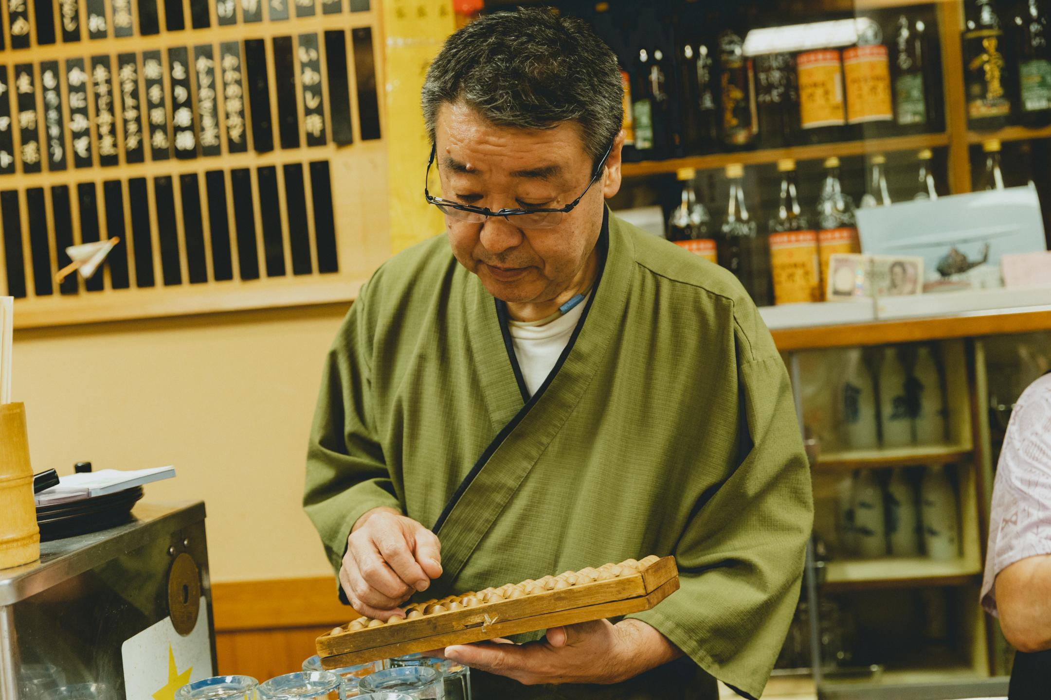 After ordering from the blackboard menu, an abacus is used to tally the number of dishes eaten for the bill.