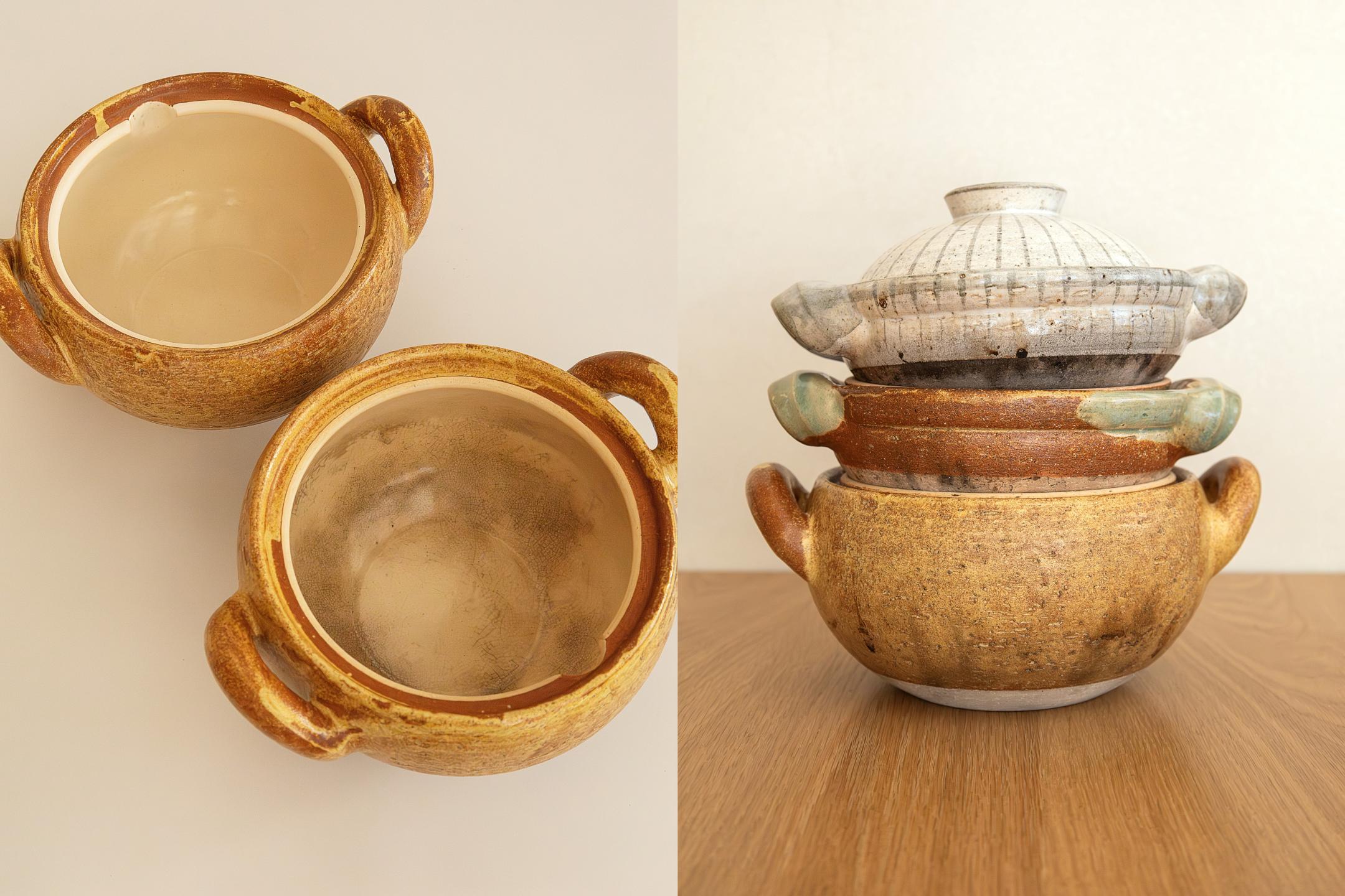 Iga-yaki is pottery made from the coarse clay found in Iga's soil, which contains microbial fossils. When fired, the fossils burn away and create pores in the vessel. Cooking in an Iga-yaki pot allows the heat stored in its pores to cook ingredients through to the core, bringing out their umami.