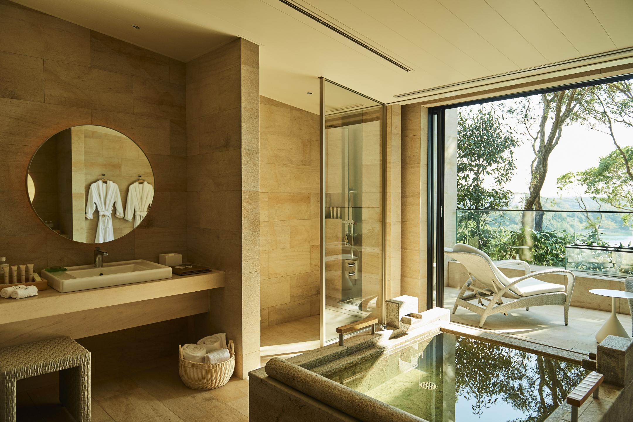 From the 2nd floor, you can gaze out across Ago Bay, then unwind in a lounge with a sofa and desk or a bath framed by wide windows. Rooms in the annex feature open layouts linking the bedroom, terrace, and hot spring bath, which turns semi-open-air when you slide the window open to let in the sea breeze.