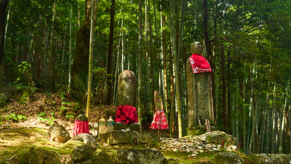A Jizo statue, about 170 cm tall, is waiting to greet you at the pass surrounded by bamboo. Legend has it that an Edo-period marksman shot this Jizo after mistaking it for a monster.