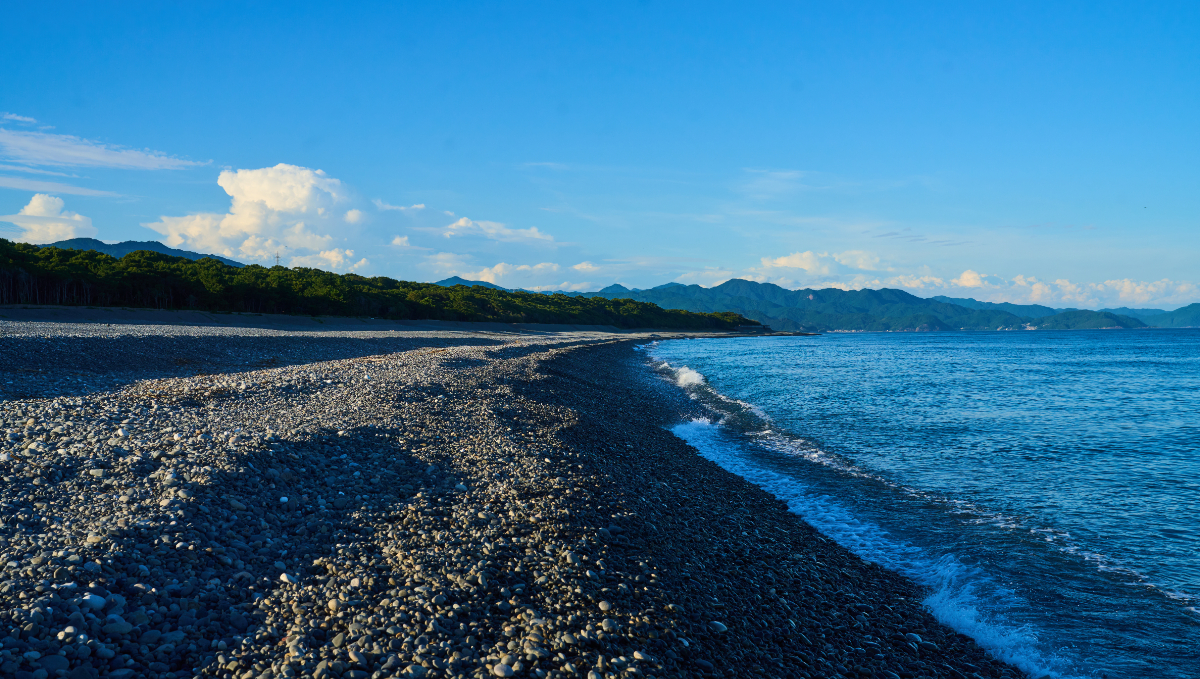 Brought here from the upper reaches of the Kumano River, Mihama pebbles cover the shore. These pebbles are smooth and silky to the touch. They make a soothing clinking sound at the water's edge, and if you walk barefoot here, the pebbles stimulate pressure points, refreshing your tired legs.