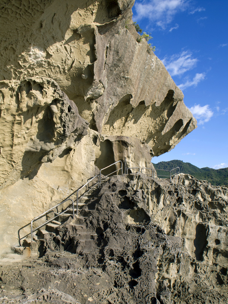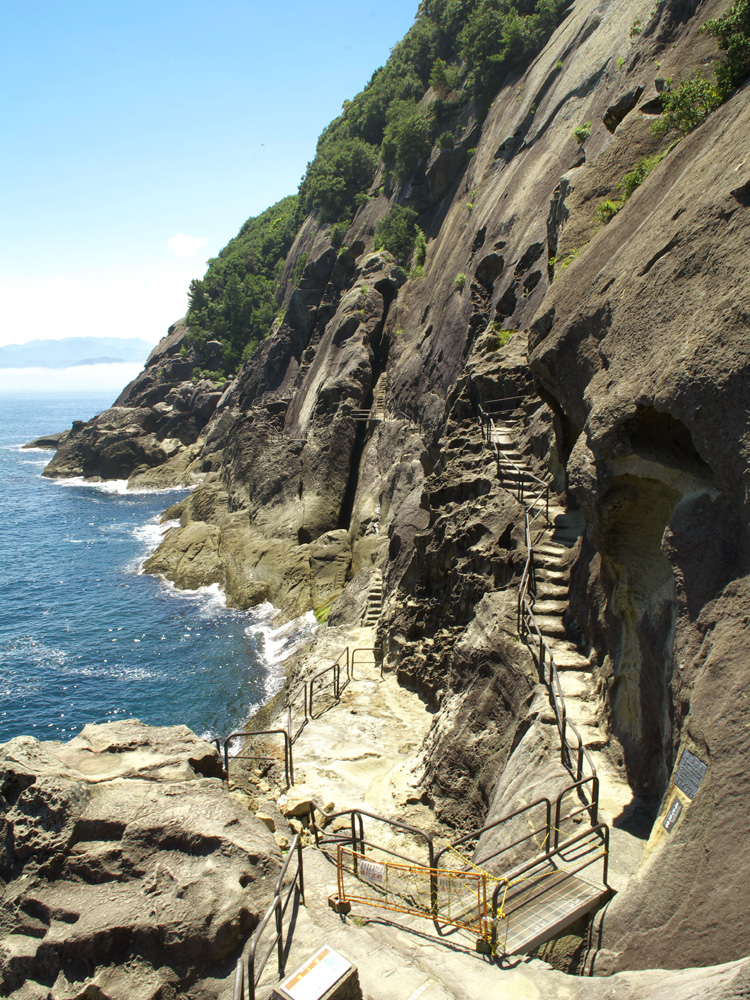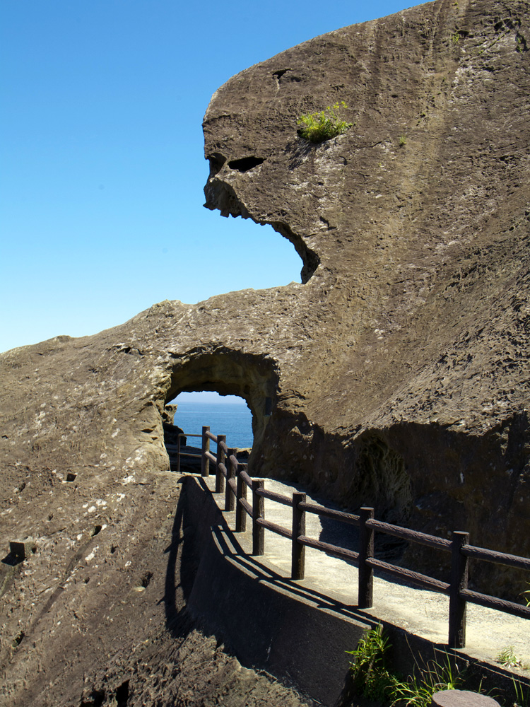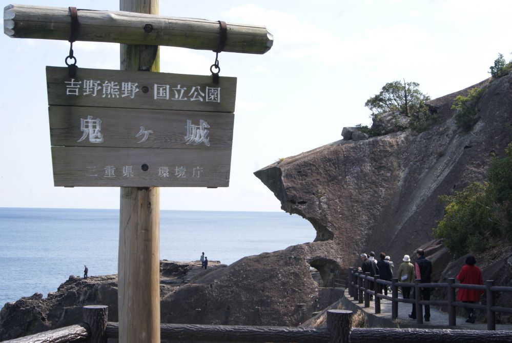 Onigajo, a work of art created by nature through geological protrusion, erosion and weathering, is a cliff that continues for 1 km along the Kumanonada Sea.