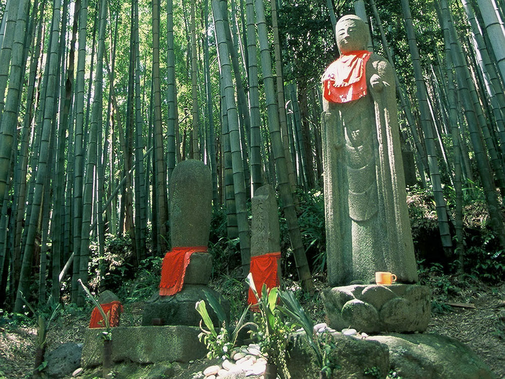 Surrounded by bamboo groves, the pass has a Jizo statue that is said to have been shot by a gun, and from the plum grove along the way, a panoramic view of Shichiri-Mihama can be seen.